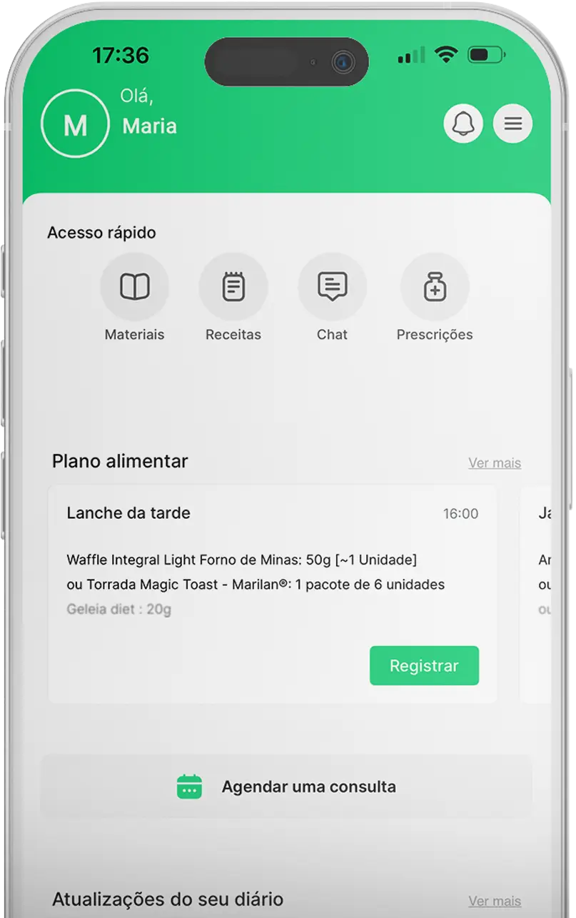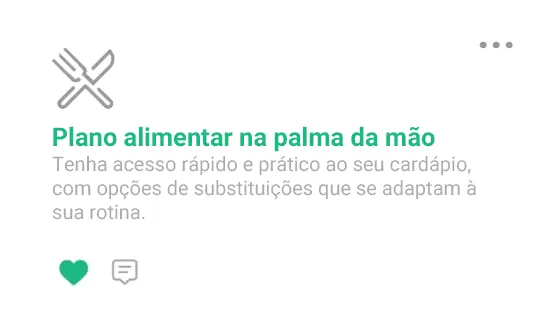 Tenha acesso exclusivo ao seu plano alimentar direto pelo aplicativo. Acompanhe sua evolução com praticidade, veja substituições e alcance resultados reais.